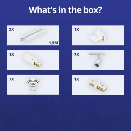 Beschreibung Komplettset 1-Phasen Rail 3 Meter Weiß | incl. 7x Spot + GU10 2700K 3W Dimmbar + Abschlusskappe, Stromanschluss und I-Verbinder