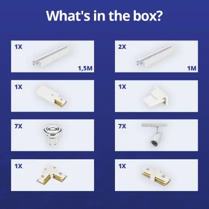 | Herstellername | Complete L shaped 1-Phase Track Set White incl. 7x Spot fixture + GU10 2700K 3W Dim – 1,5 x 2 meter | |