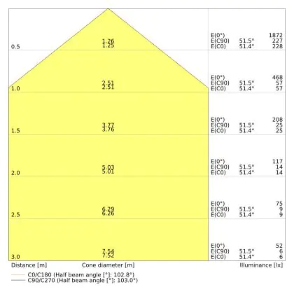 Beispiel: Wird eine Lampe mit einem Abstrahlwinkel von 60 Grad an der Decke (2,5 m Höhe) angebracht, erzeugt sie einen Lichtkegel von 2,9 Metern Durchmesser. Hat die Lampe hingegen einen Abstrahlwinkel von 120 Grad, beträgt der Lichtkegel 8,7 Meter im Durchmesser. |