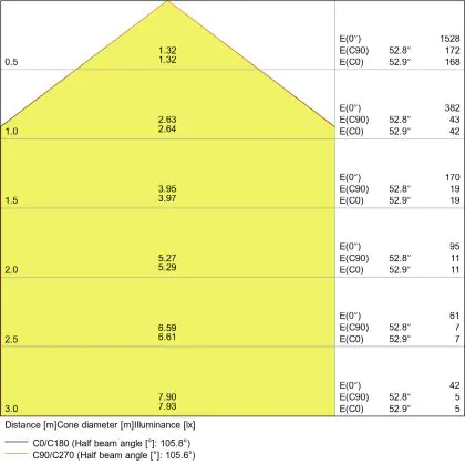 Beispiel: Wird eine Lampe mit einem Abstrahlwinkel von 60 Grad an der Decke (2,5 m Höhe) angebracht, erzeugt sie einen Lichtkegel von 2,9 Metern Durchmesser. Hat die Lampe hingegen einen Abstrahlwinkel von 120 Grad, beträgt der Lichtkegel 8,7 Meter im Durchmesser. |