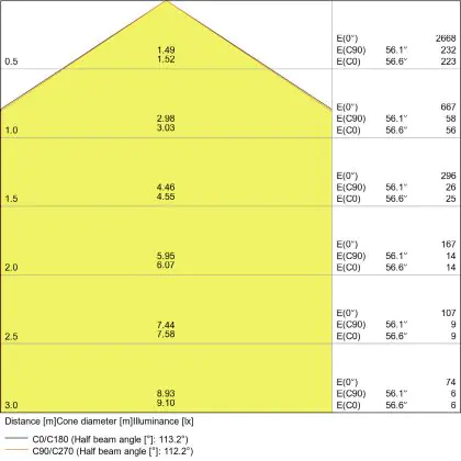 Beispiel: Wird eine Lampe mit einem Abstrahlwinkel von 60 Grad an der Decke (2,5 m Höhe) angebracht, erzeugt sie einen Lichtkegel von 2,9 Metern Durchmesser. Hat die Lampe hingegen einen Abstrahlwinkel von 120 Grad, beträgt der Lichtkegel 8,7 Meter im Durchmesser. |