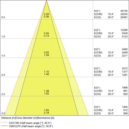 Beispiel: Wird eine Lampe mit einem Abstrahlwinkel von 60 Grad an der Decke (2,5 m Höhe) angebracht, erzeugt sie einen Lichtkegel von 2,9 Metern Durchmesser. Hat die Lampe hingegen einen Abstrahlwinkel von 120 Grad, beträgt der Lichtkegel 8,7 Meter im Durchmesser. |