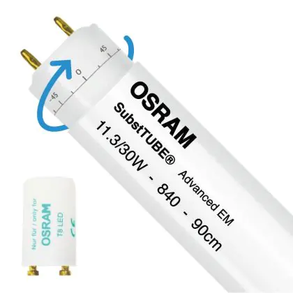 Die Osram SubstiTUBE Advanced EM T8 ist eine LED Röhre mit einem G13 Sockel für Anwendungsbereiche wie z.B. Beleuchtung von Produktionsbereichen, Verkehrszonen, Korridoren, Supermärkte, Kaufhäuser und Industrie. Die Röhre besitzt eine Länge von 90 cm und ist in verschiedenen Farbtemperaturen erhältlich. Sie ersetzt herkömmliche T8 Leuchtstoffröhren mit 30 Watt. Diese Röhren sind nur für den Innenbereich verfügbar und können nur mit geeigneter Leuchte im Außenbereich genutzt werden. Die integrierten LED-Chips besitzen eine Lebensdauer von 60.000 Stunden, was in einer durchschnittlichen Anwendung von mehr als 15 Jahren entspricht. Durch den Wechsel zu LED, können Sie bis zu 80 % Energie einsparen. Durch die nicht benötigten Wartungs- und Ersatzkosten, ist eine kurze Amortisationszeit ebenfalls garantiert.
