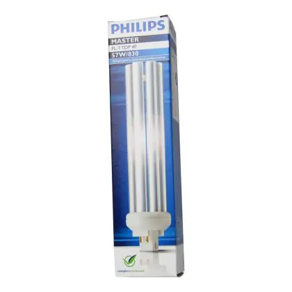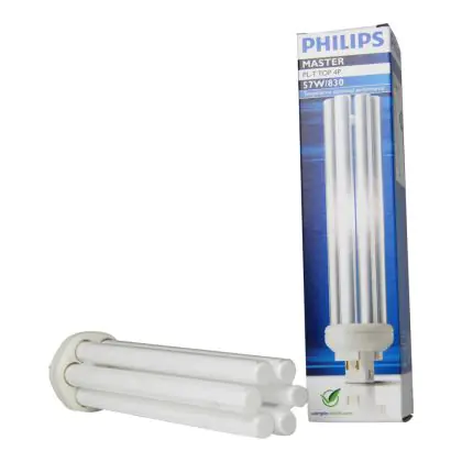 Philips PL-T TOP 57W 830 4P schaffen eine hervorragende Lichtqualität aufgrund eines Farbwiedergabeindex von 80-89Ra. Die Farbtemperatur des Lichts ist warm (3000K). Diese Lampen werden oft zur Beleuchtung in Schulen, Büros und Kantinen verwendet.