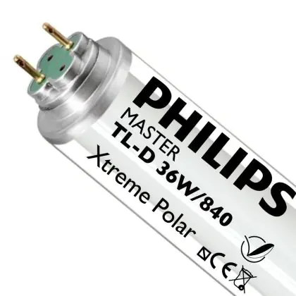 Die Philips MASTER TL-D Polar Xtreme 36W - 840 Kaltweiß | 120cm ist eine Leuchtstoffröhre mit einer Länge von 1200 mm. Das Produkt hat einen Durchmesser von 41 mm. Die Röhre strahlt Licht in der Farbtemperatur 4000K - Kaltweiß aus und punktet durch eine lange Lebensdauer.